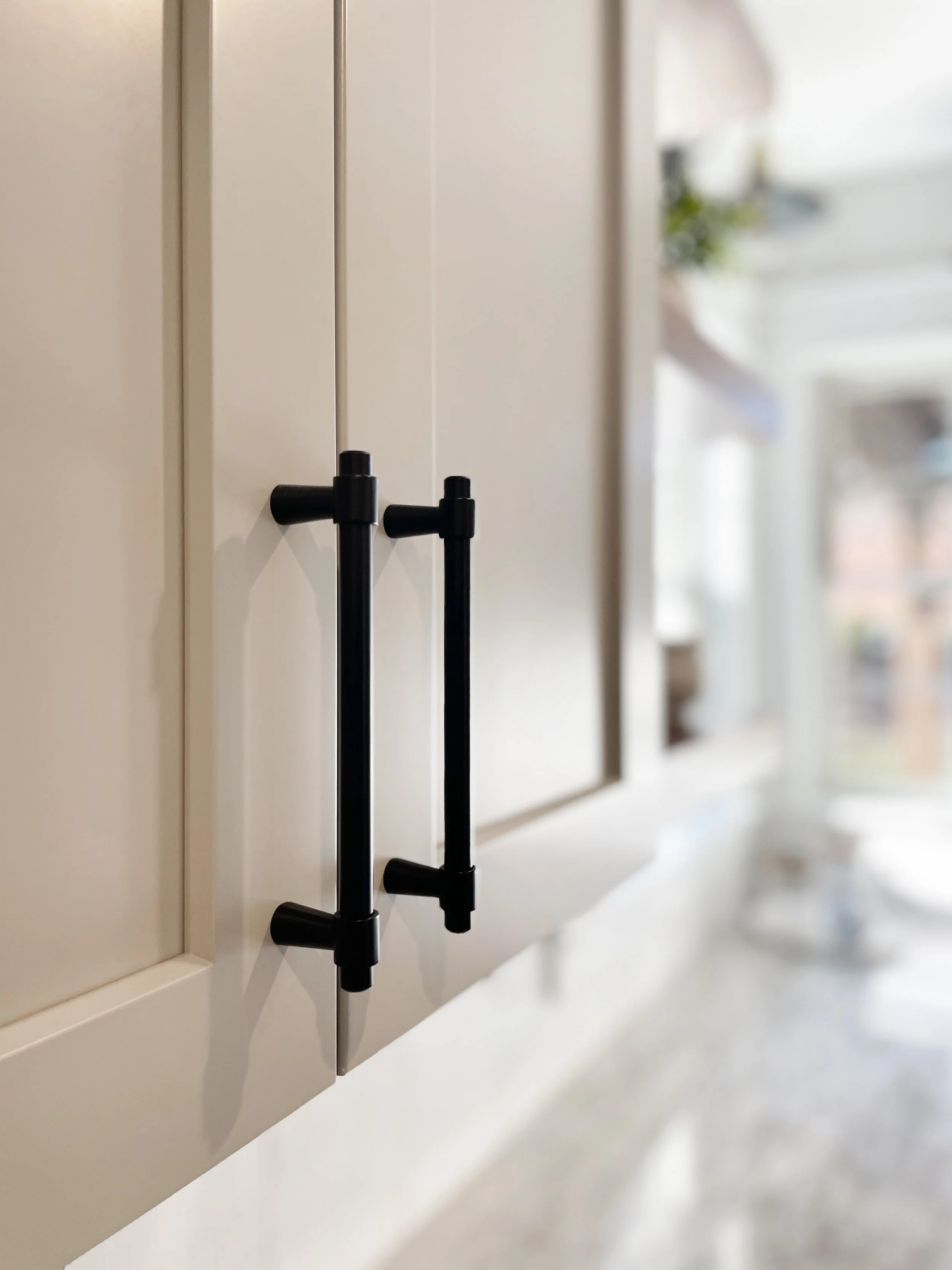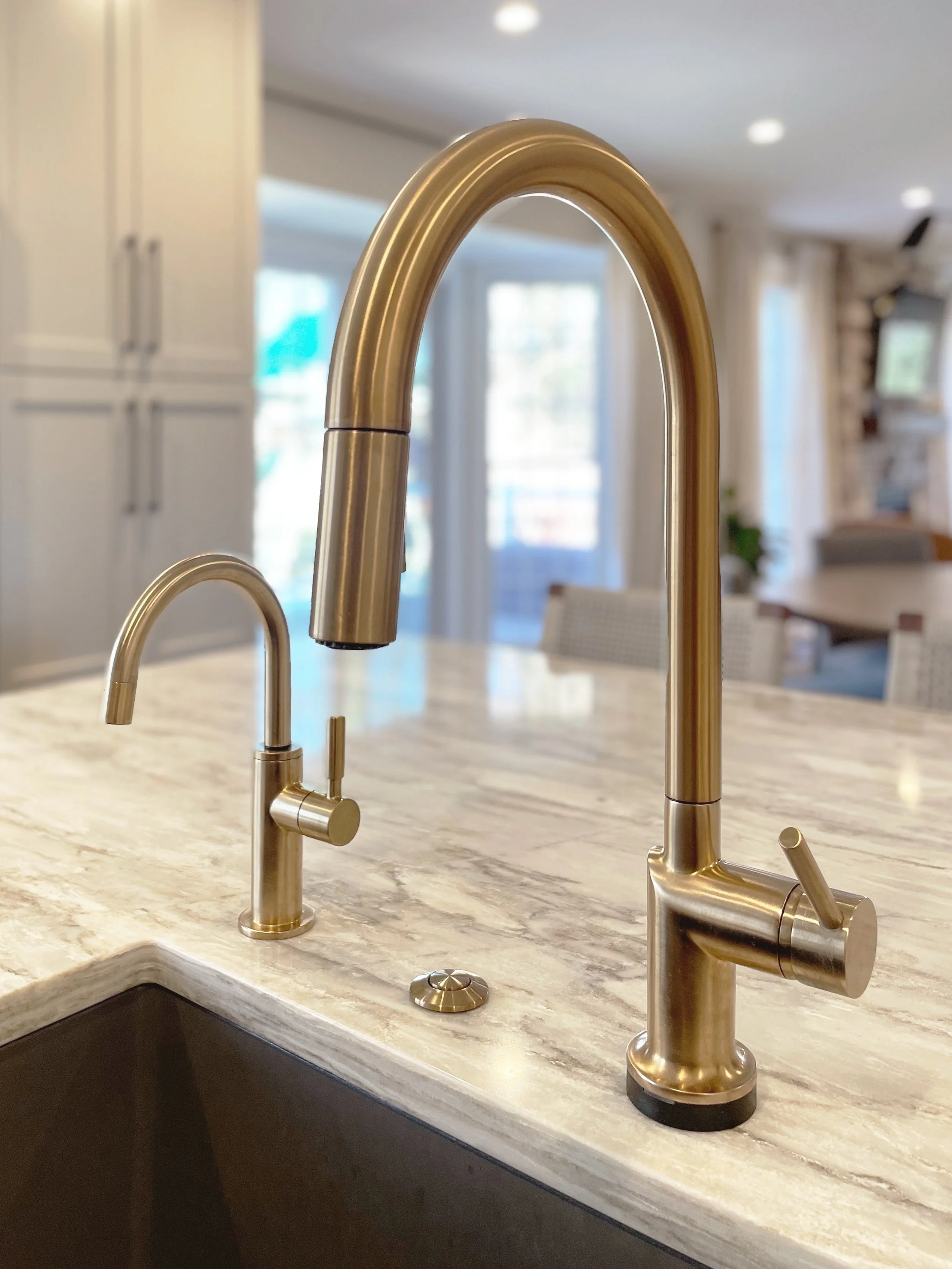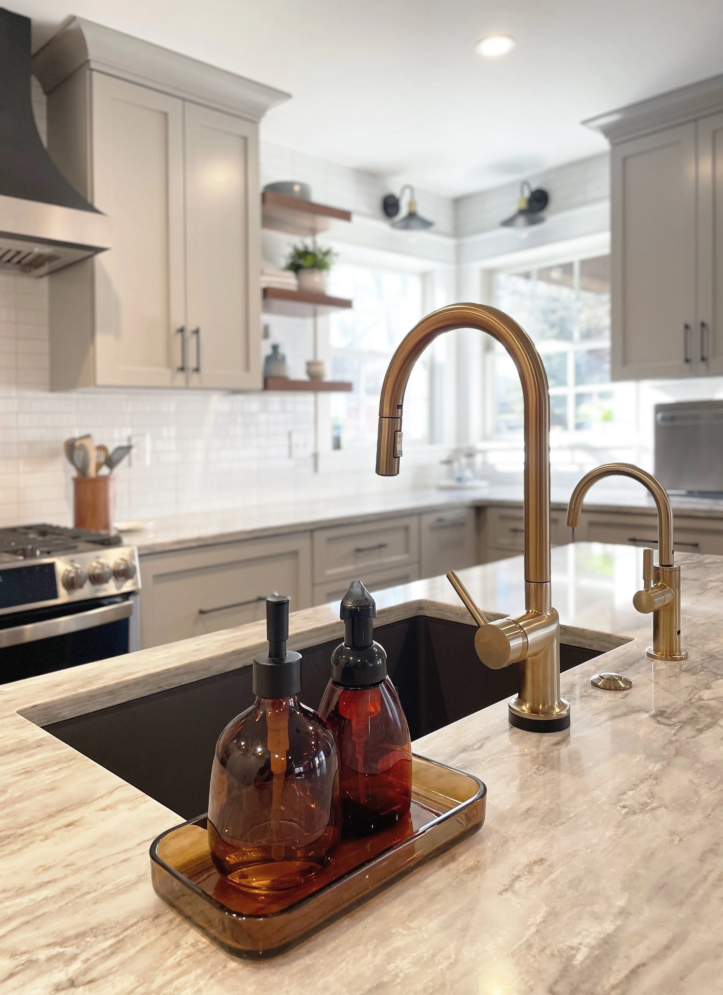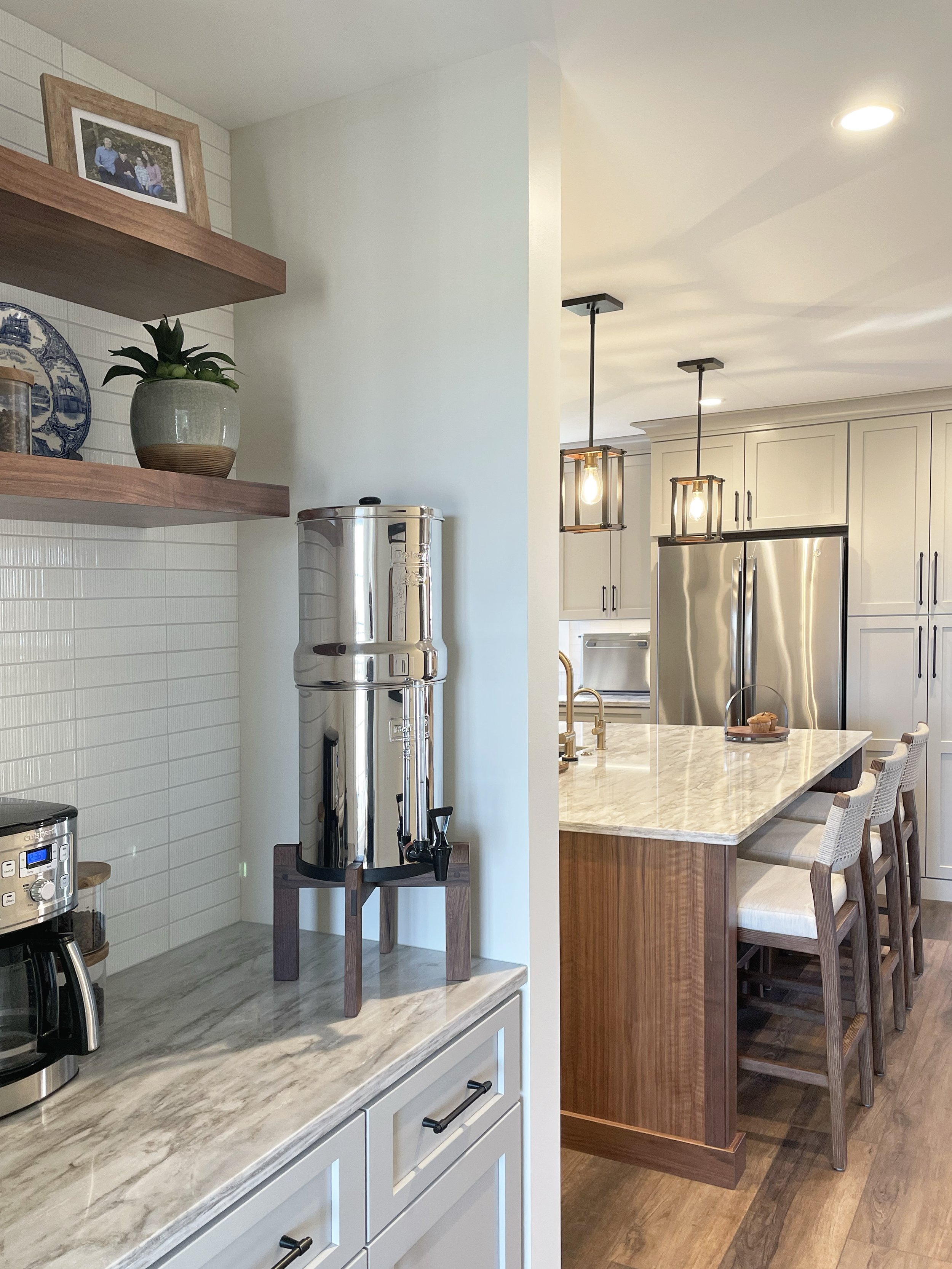 From the well-planned spatial layout and cabinetry configuration, to the oversize island with hidden storage, and the addition of a tucked-away beverage nook, this kitchen makes cooking and entertaining a breeze and a joy! But it doesn’t stop with the functionality.. it’s design vibe is what makes it shine. From the subtle greige cabinets and contrasting walnut island, to the soft pattern of the expansive quartz countertops, to the blended metallic details.. this kitchen screams simple beauty!