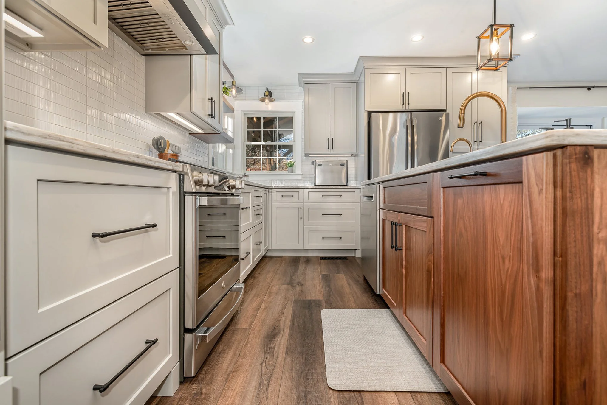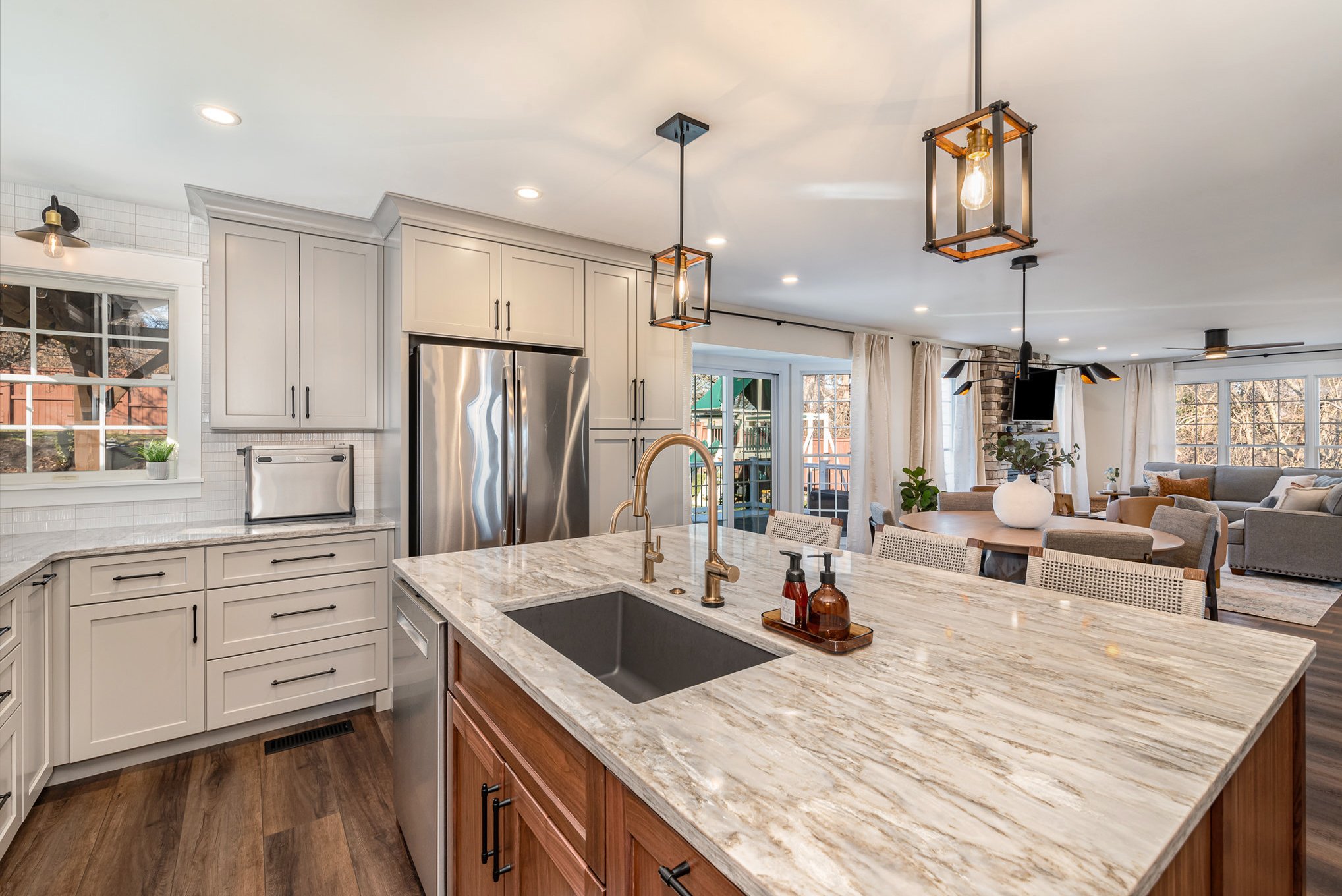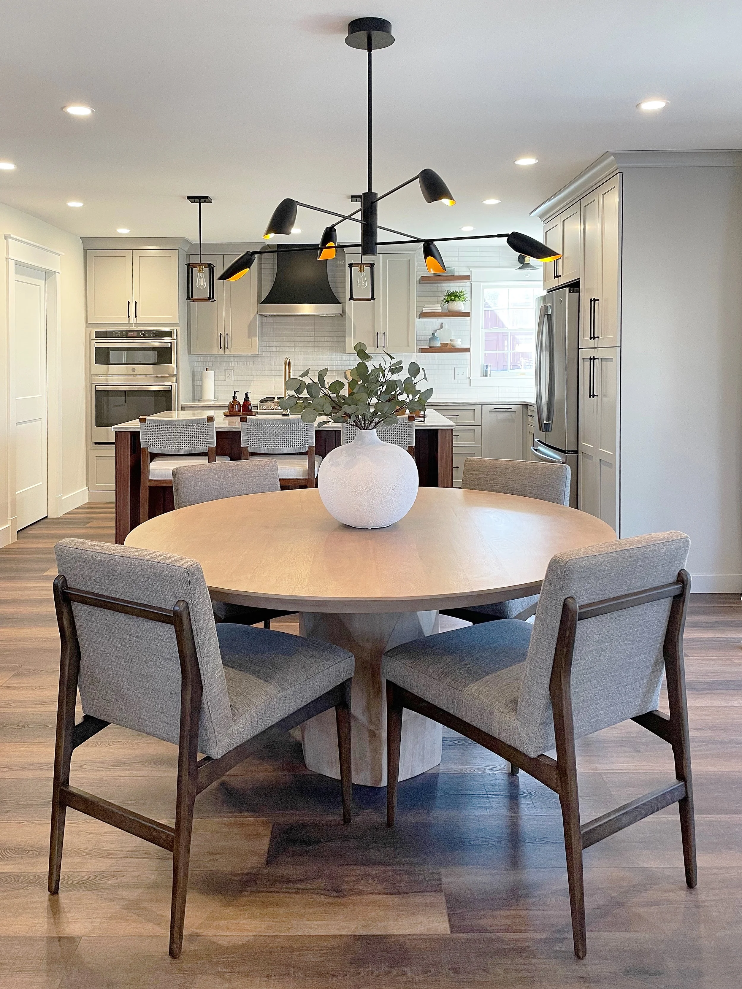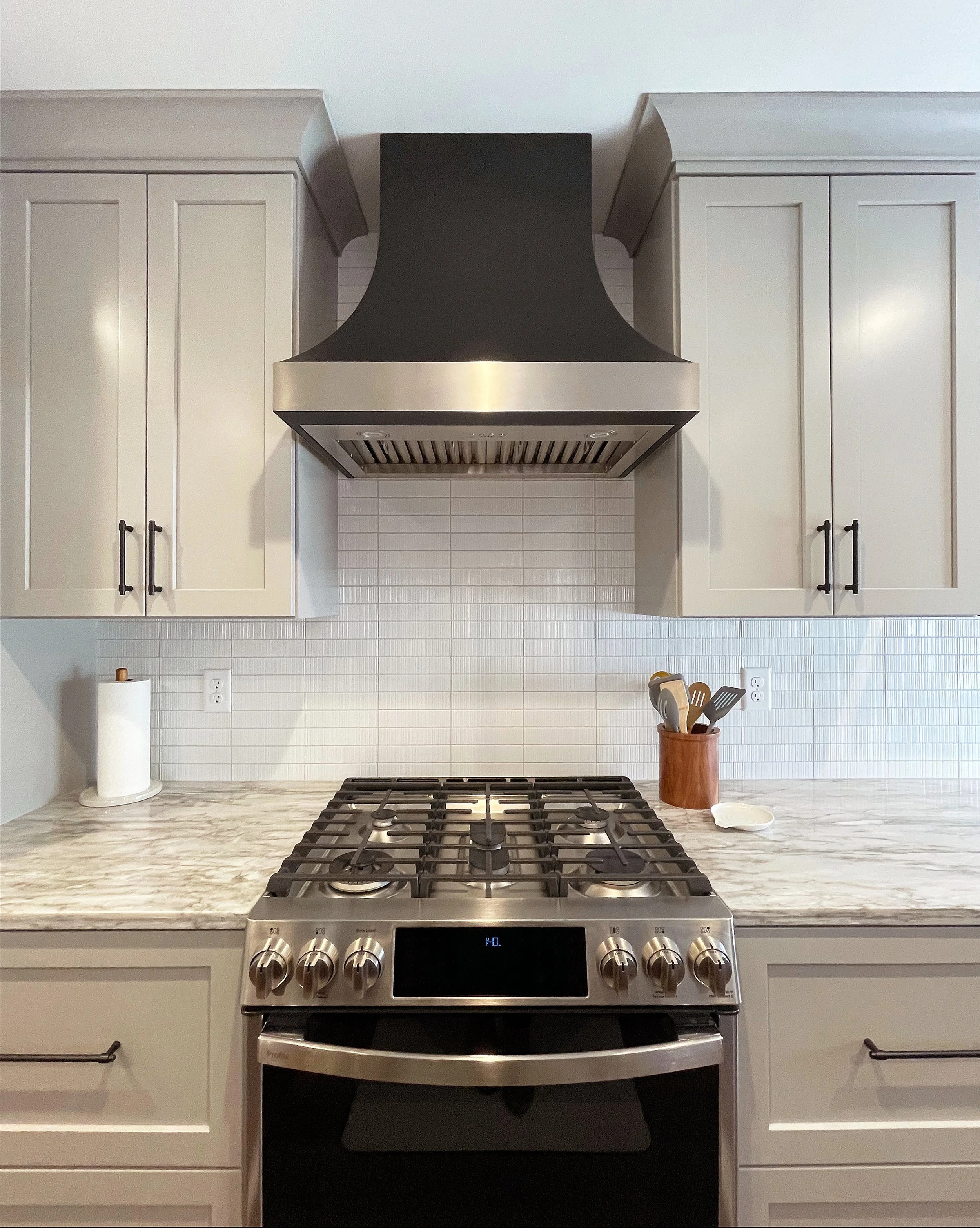 From the well-planned spatial layout and cabinetry configuration, to the oversize island with hidden storage, and the addition of a tucked-away beverage nook, this kitchen makes cooking and entertaining a breeze and a joy! But it doesn’t stop with the functionality.. it’s design vibe is what makes it shine. From the subtle greige cabinets and contrasting walnut island, to the soft pattern of the expansive quartz countertops, to the blended metallic details.. this kitchen screams simple beauty!