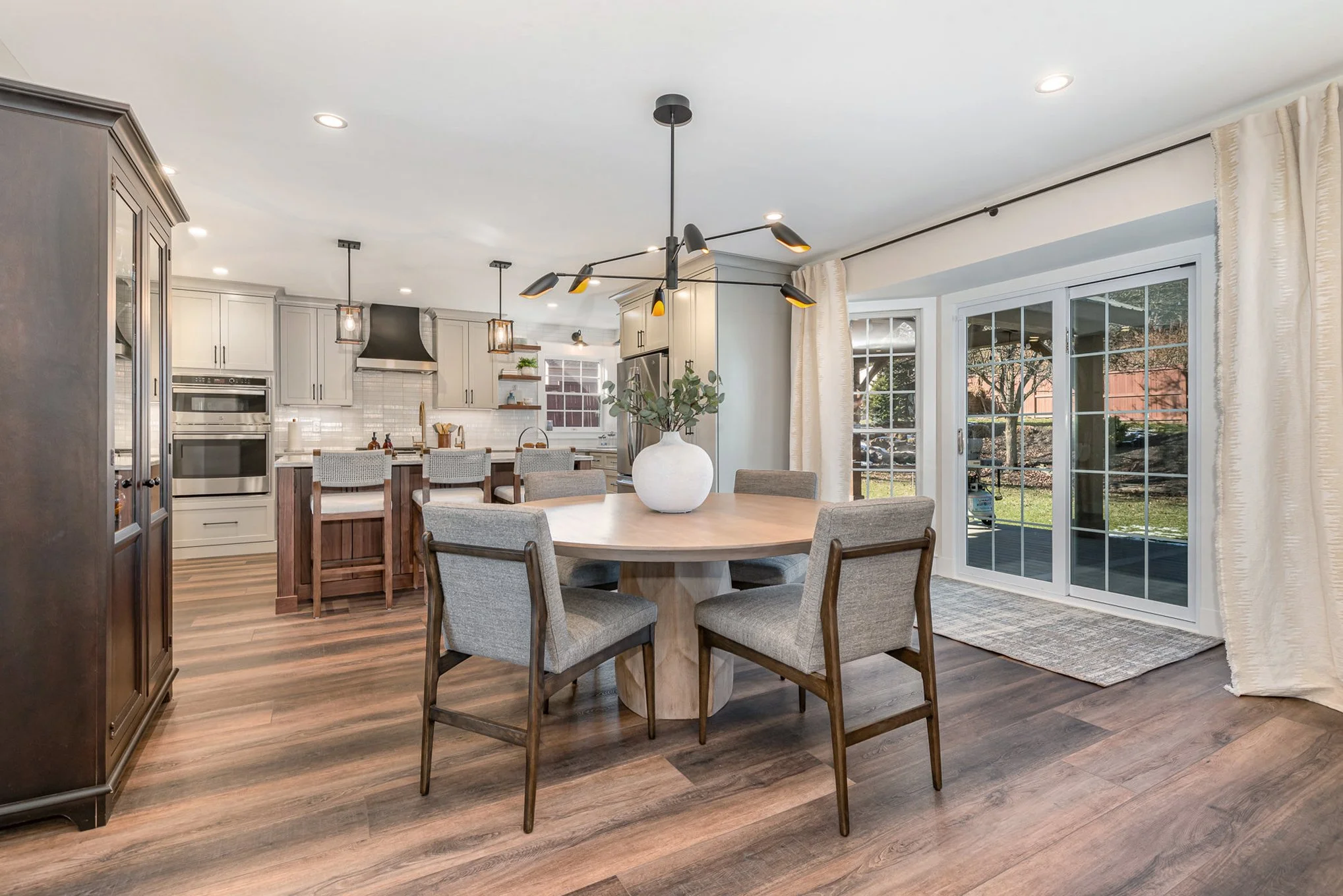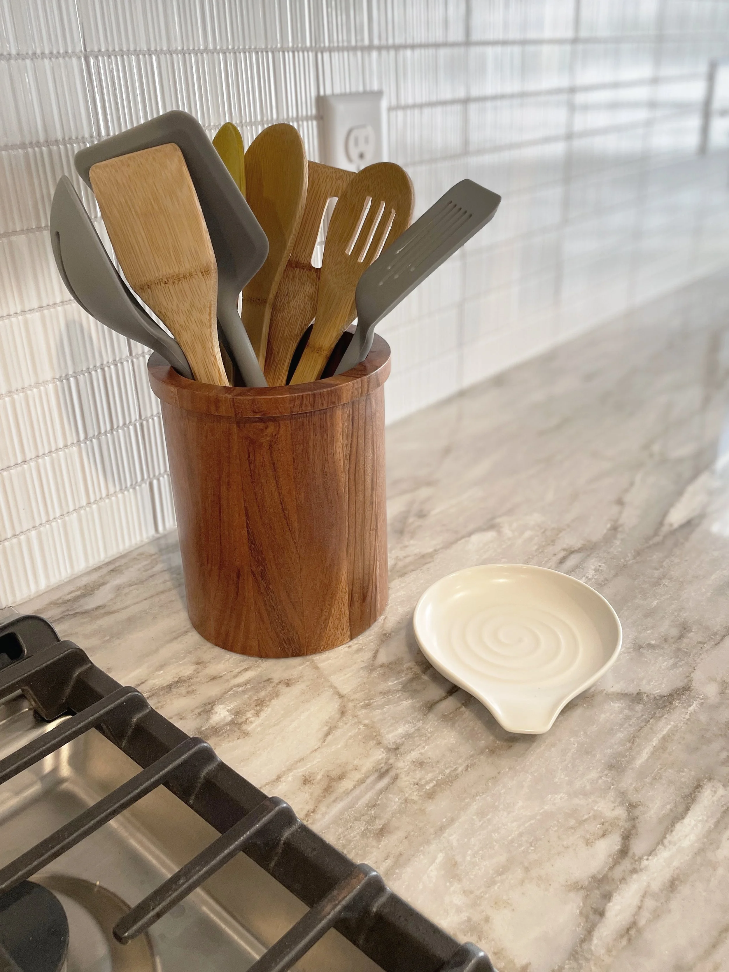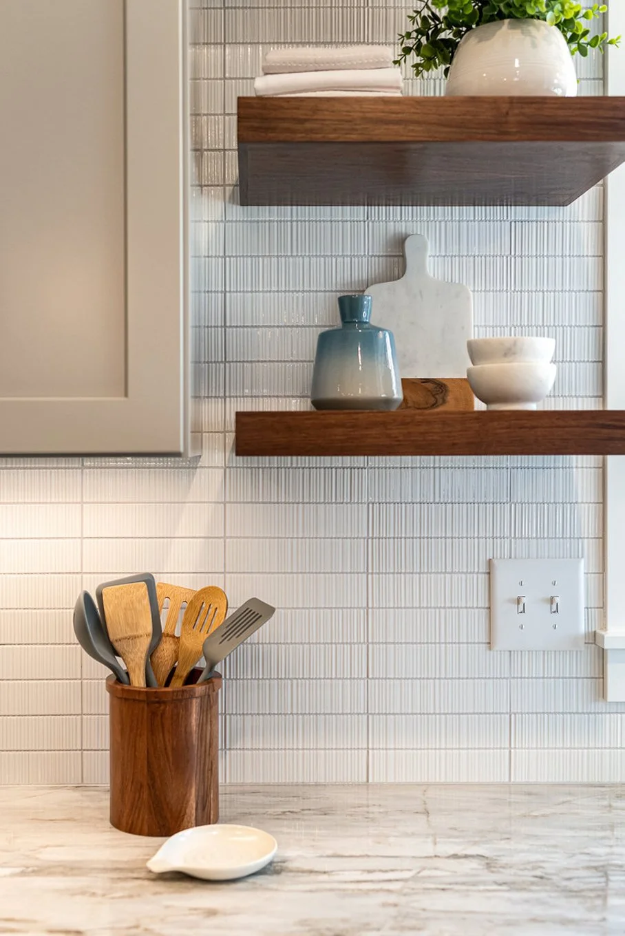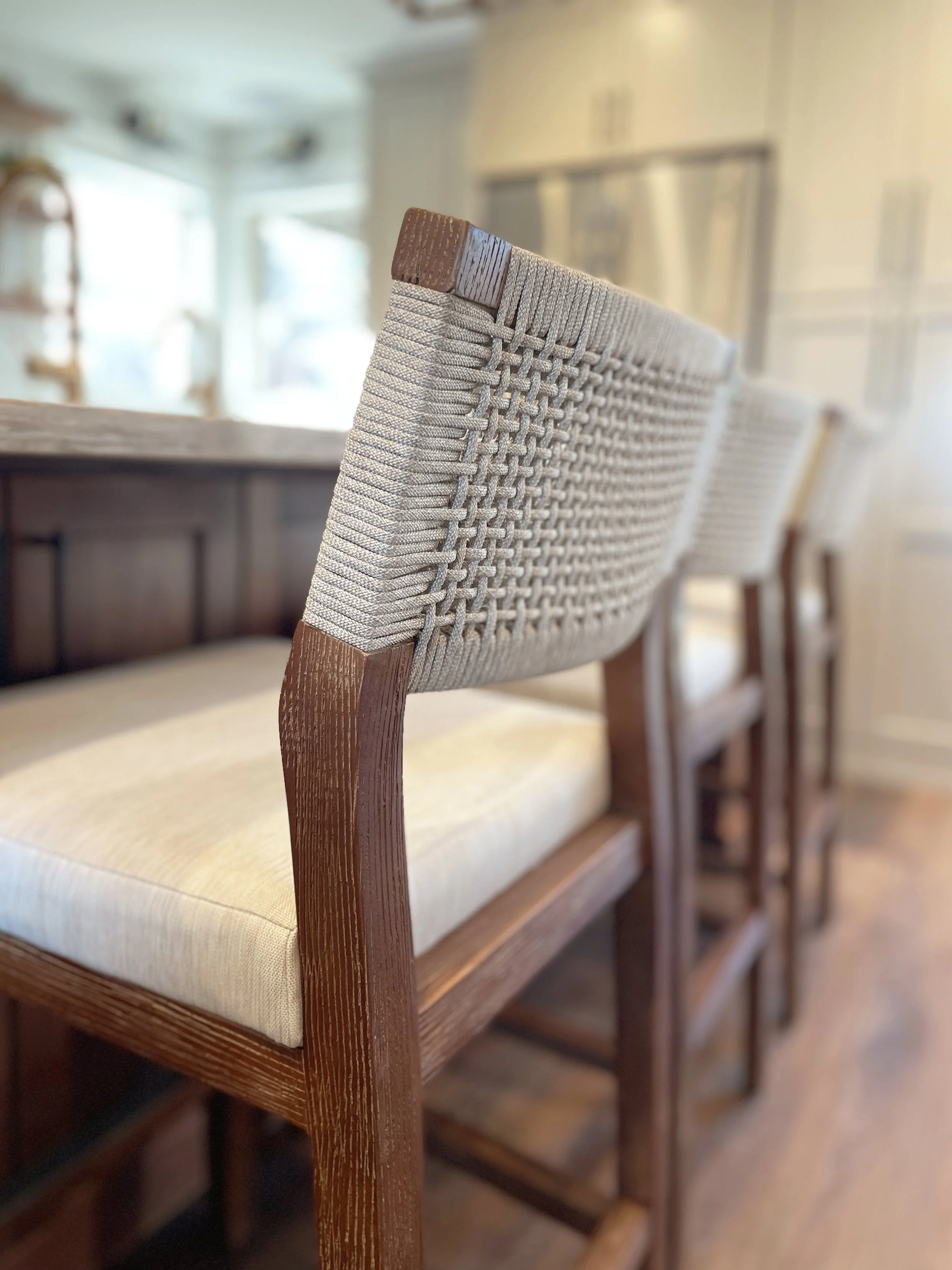 From the well-planned spatial layout and cabinetry configuration, to the oversize island with hidden storage, and the addition of a tucked-away beverage nook, this kitchen makes cooking and entertaining a breeze and a joy! But it doesn’t stop with the functionality.. it’s design vibe is what makes it shine. From the subtle greige cabinets and contrasting walnut island, to the soft pattern of the expansive quartz countertops, to the blended metallic details.. this kitchen screams simple beauty!