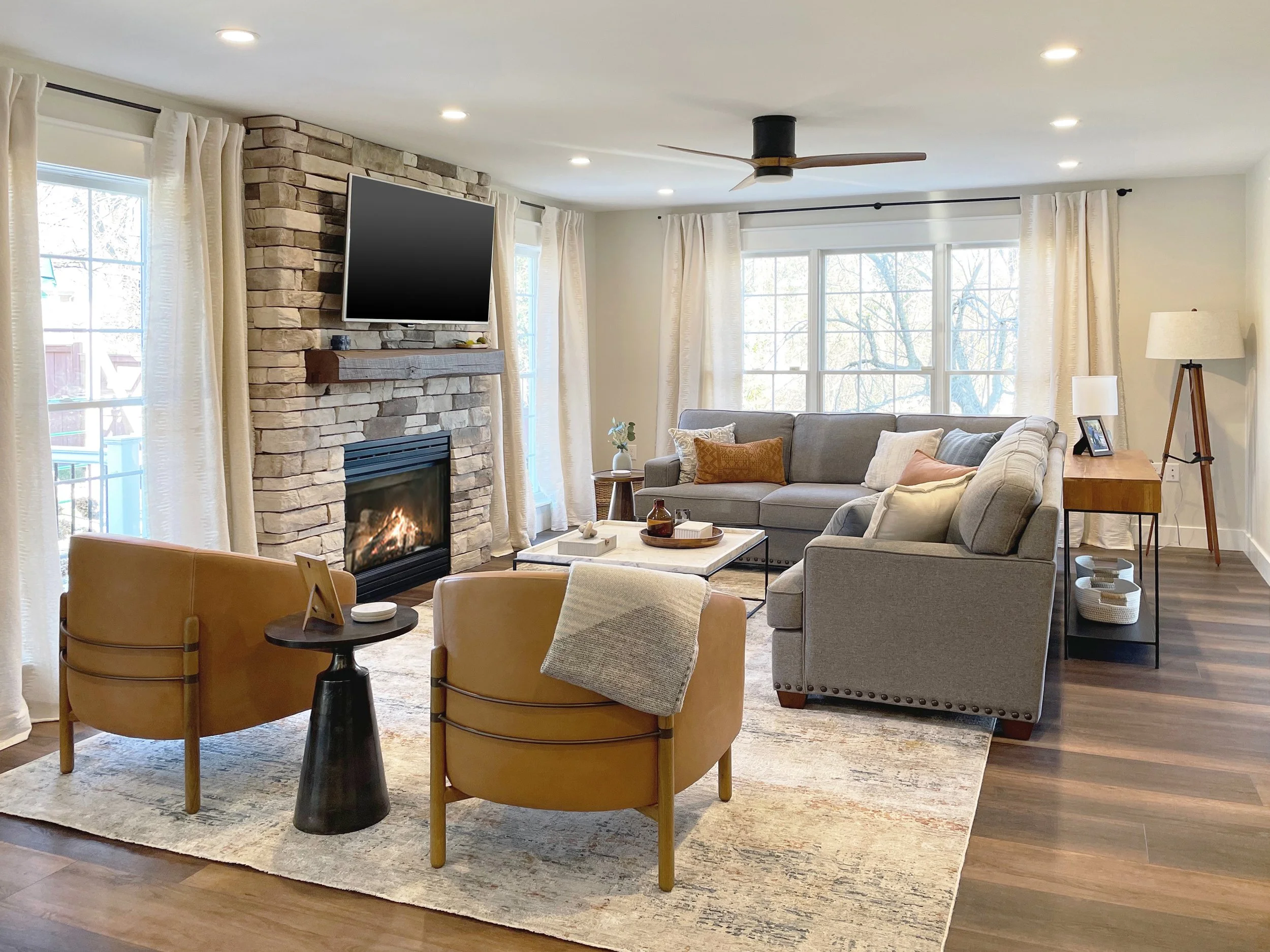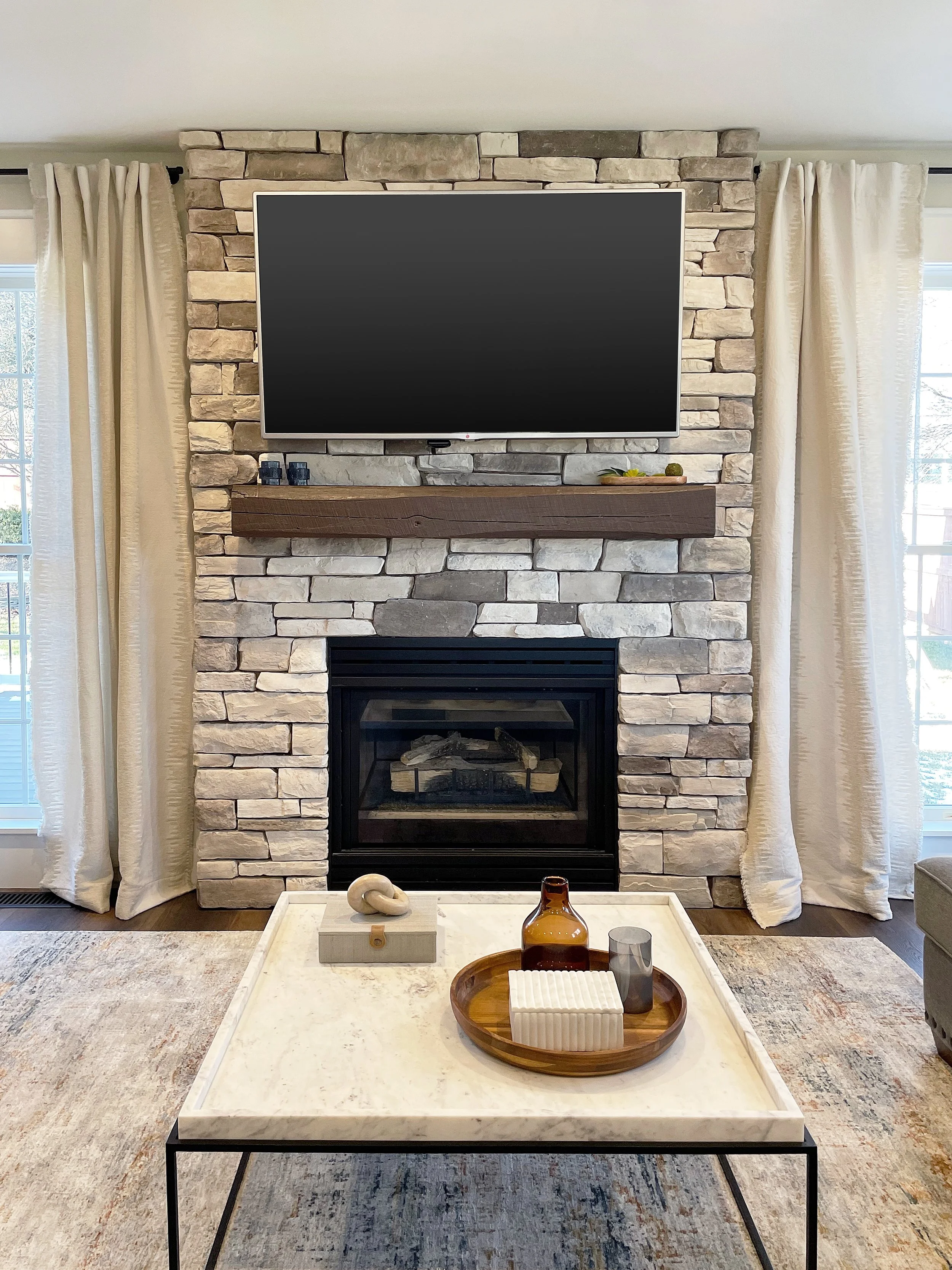 This family room is the perfect balance between classic sophistication and cozy casual vibes. We’ve paired a large comfortable sectional for snuggling during family movie nights with two stylish leather barrel chairs for entertaining guests during dinner parties. The stone clad fireplace lends ambiance when hosting gatherings with friends, while the big screen television takes center stage when you just want to chill and binge Netflix shows with the fam. We’ve designed the space to truly be a multi-functional classic yet cozy space for all the needs of this young family!
