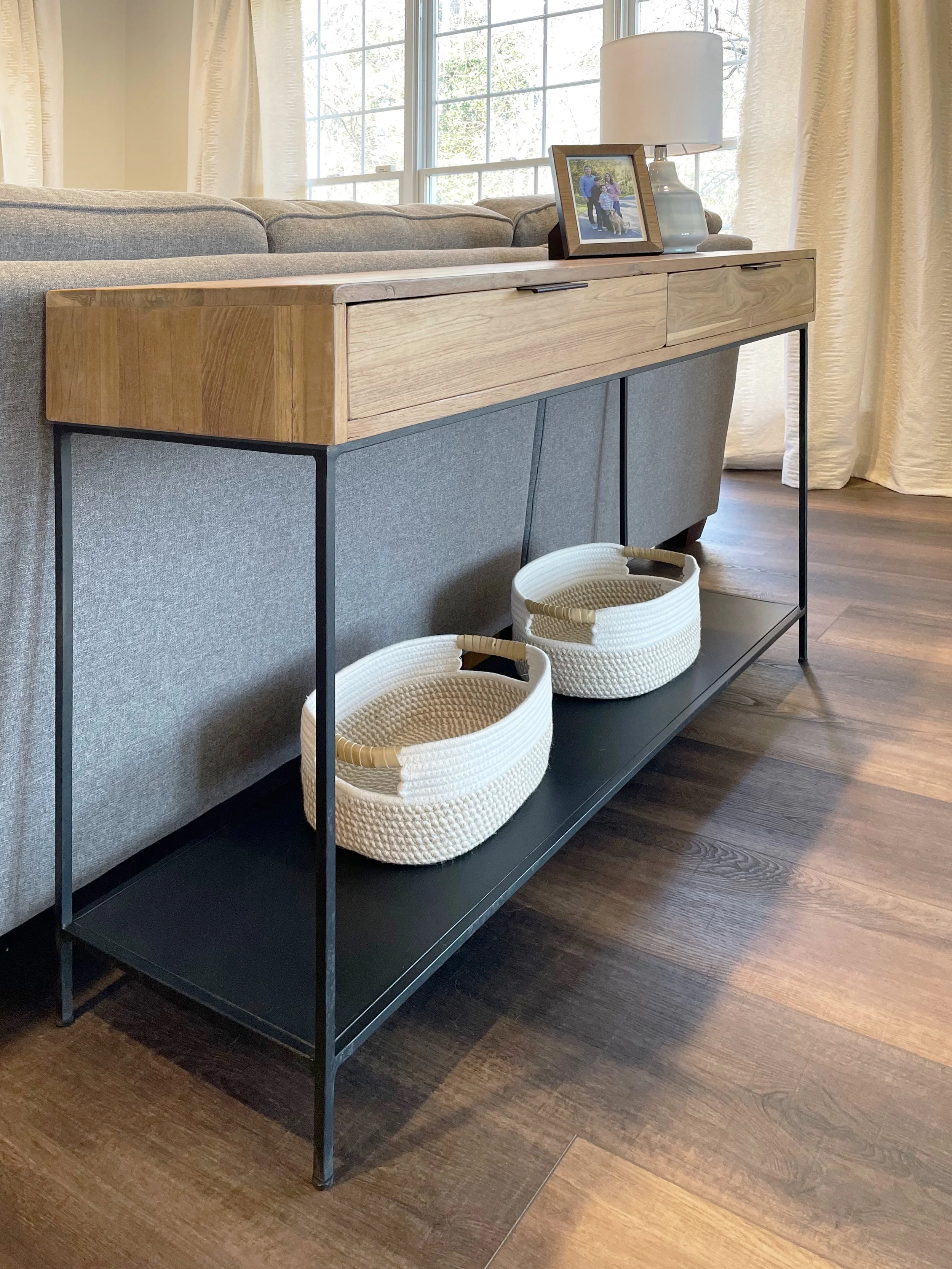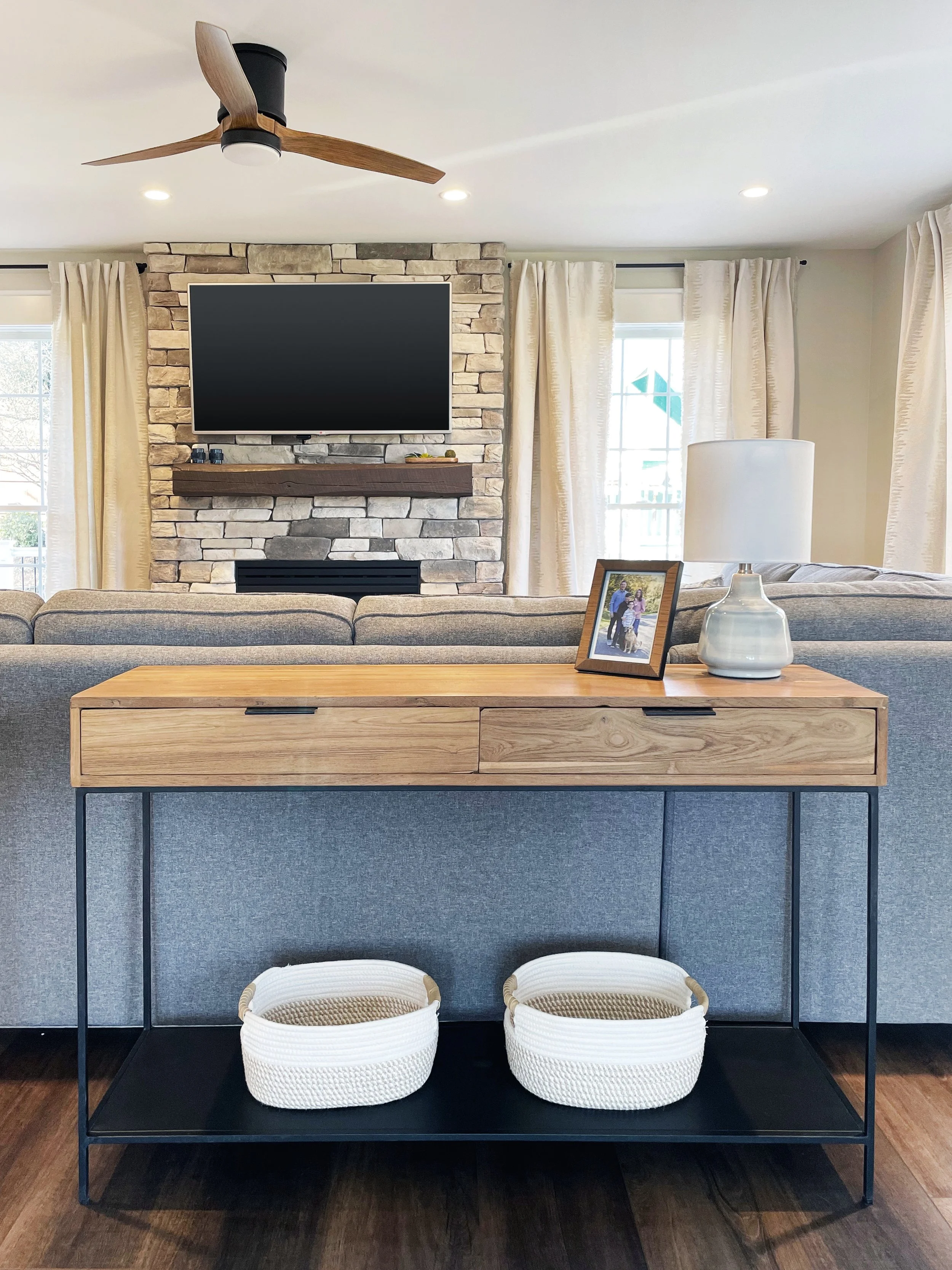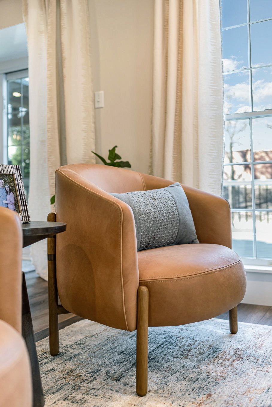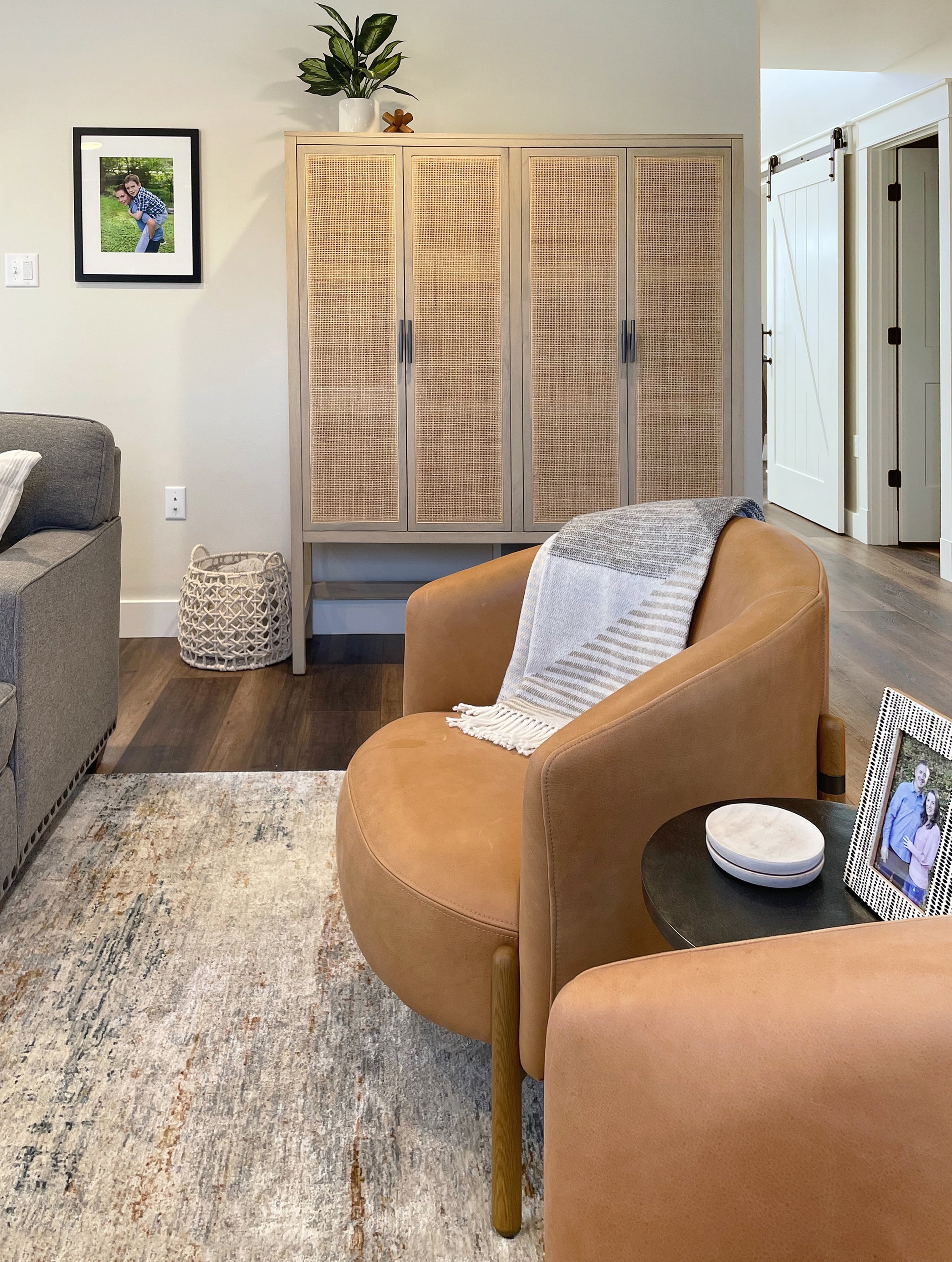 With the blend of warm woods, rich leather, bright natural neutrals, and a dash of cool grays and blues, this space really feels warm, cozy and inviting! A durable yet super soft rug, piles of plush pillows, and a woven throw blanket tossed over the armchair make this space super cozy, not to mention the collection of family photos, candles, and greenery that bring light and life into the space. We’ve designed a family room that truly feels like home!