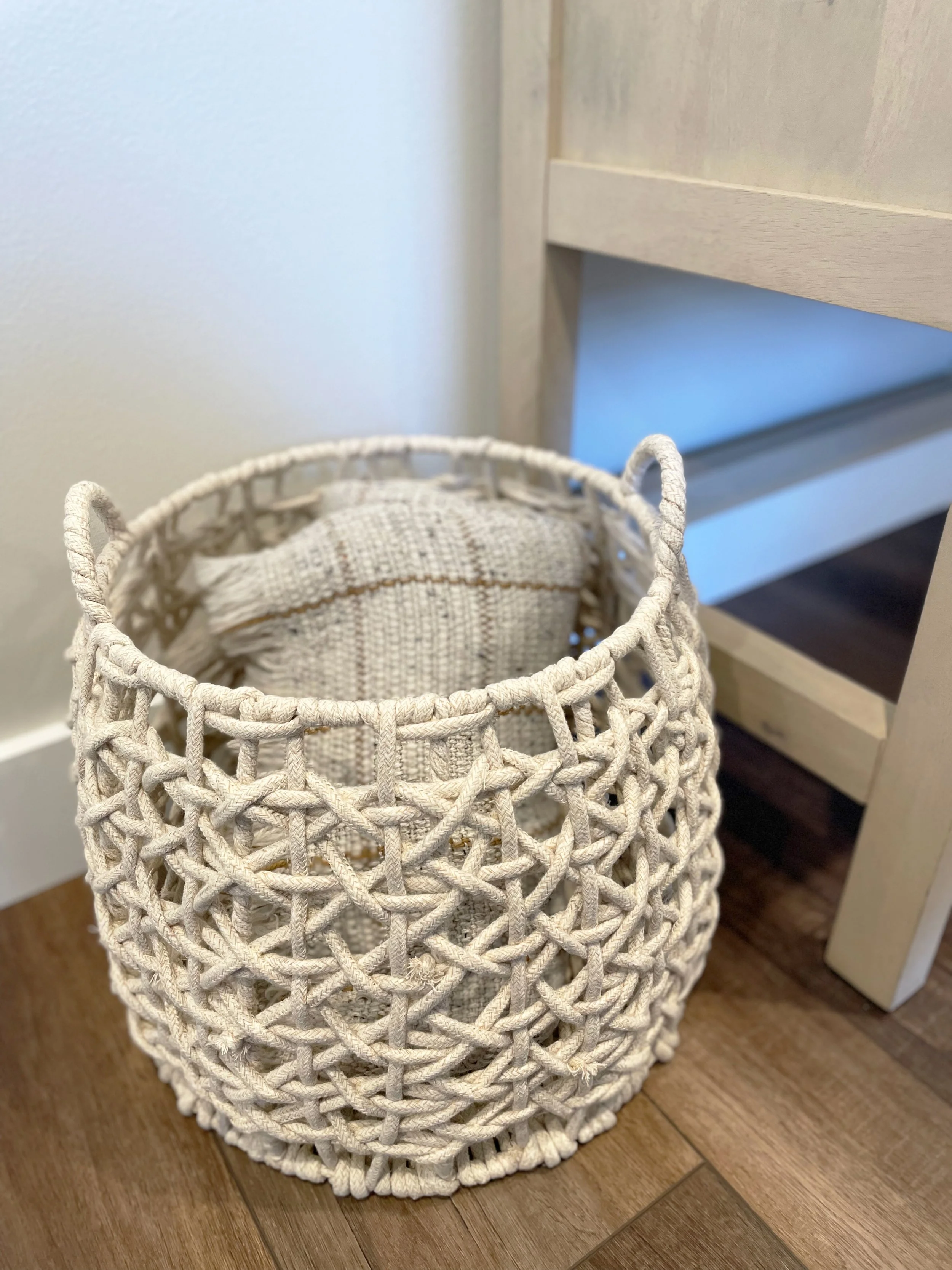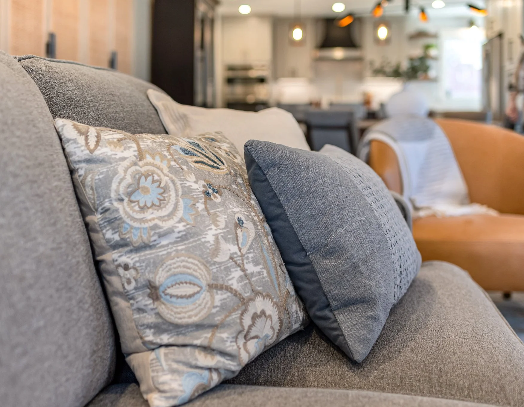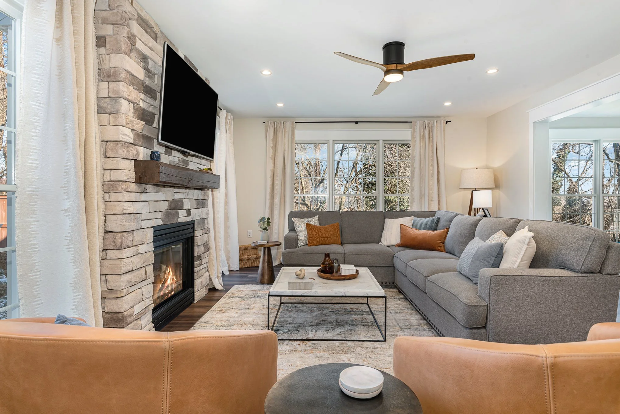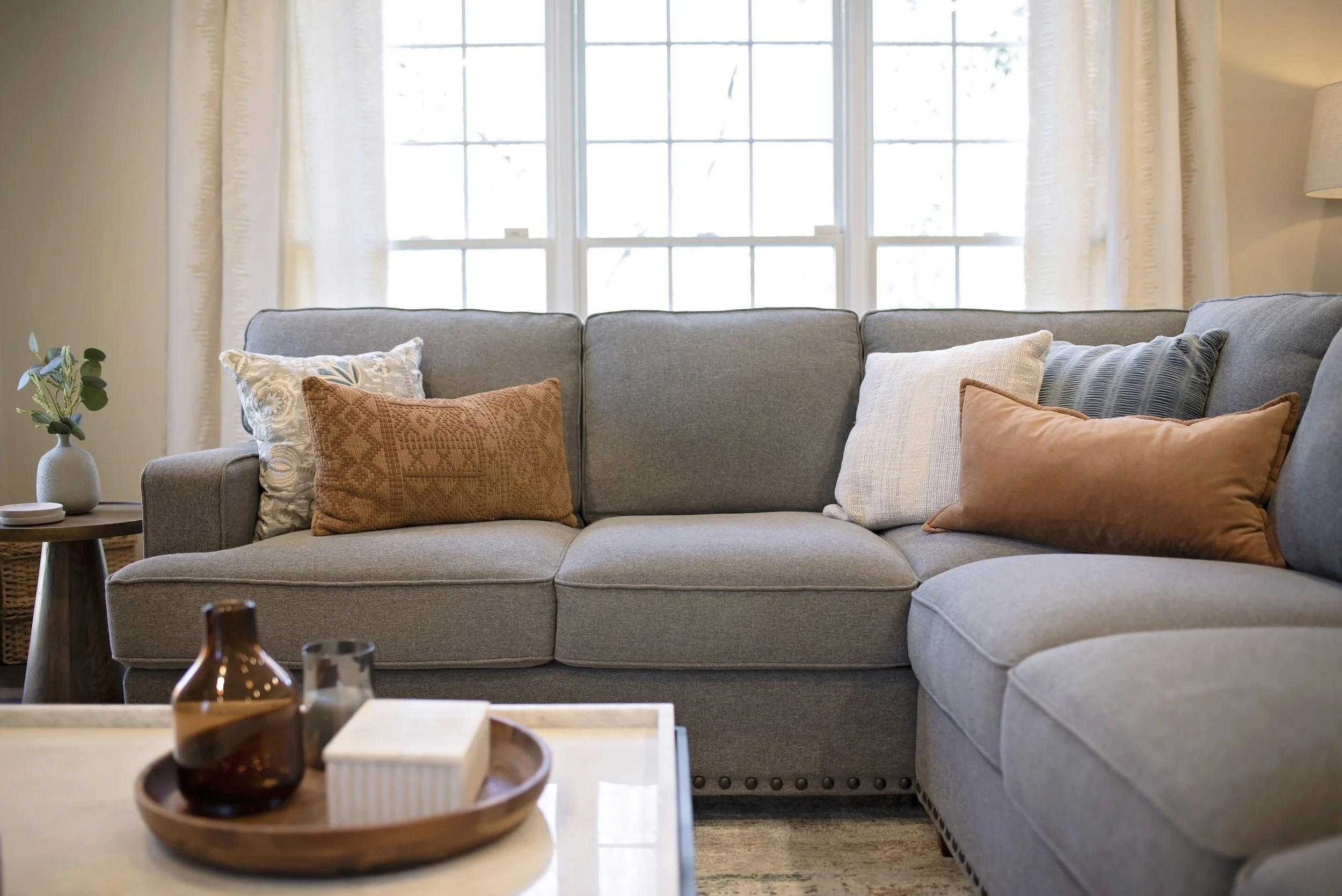 With the blend of warm woods, rich leather, bright natural neutrals, and a dash of cool grays and blues, this space really feels warm, cozy and inviting! A durable yet super soft rug, piles of plush pillows, and a woven throw blanket tossed over the armchair make this space super cozy, not to mention the collection of family photos, candles, and greenery that bring light and life into the space. We’ve designed a family room that truly feels like home!