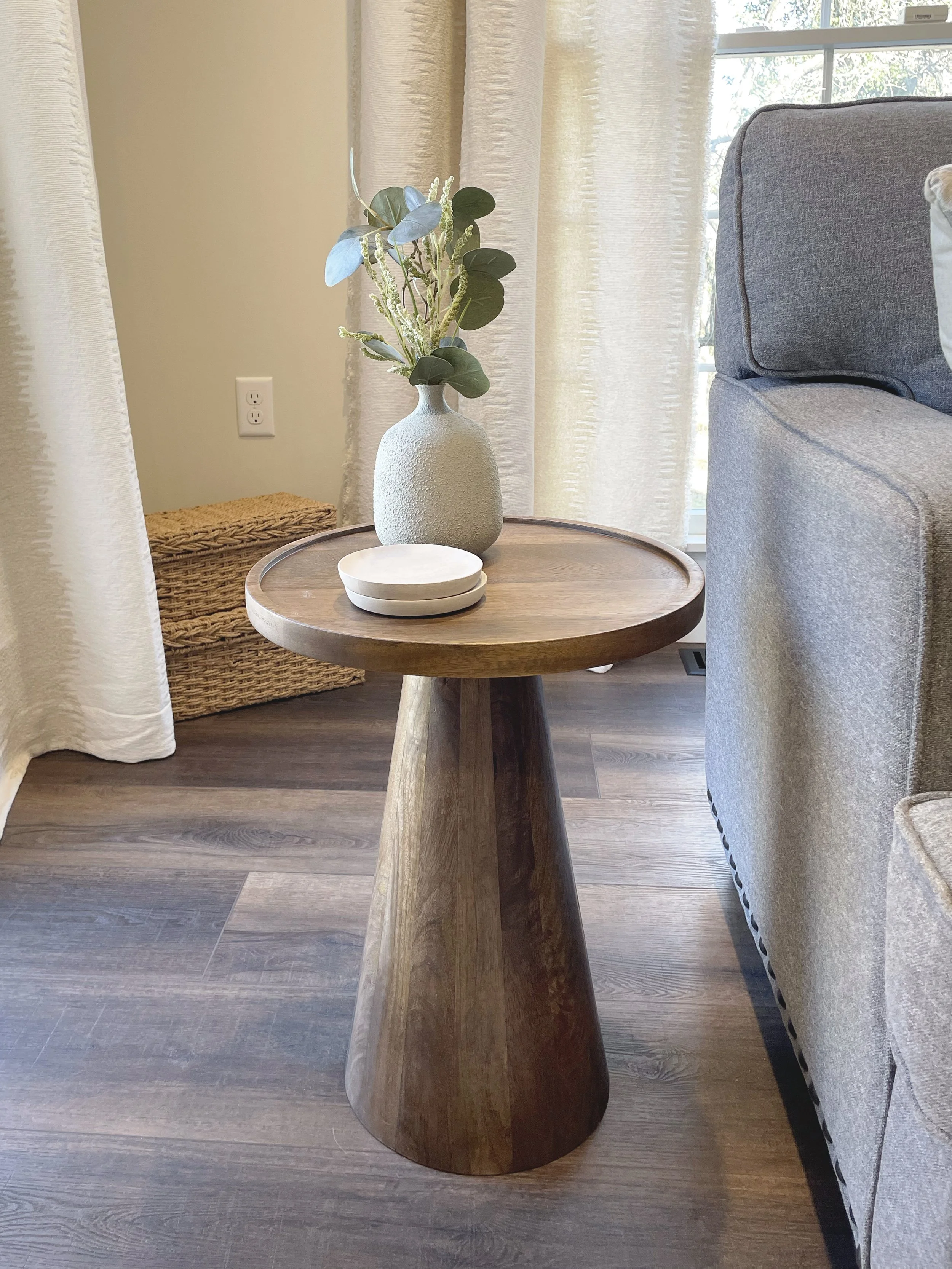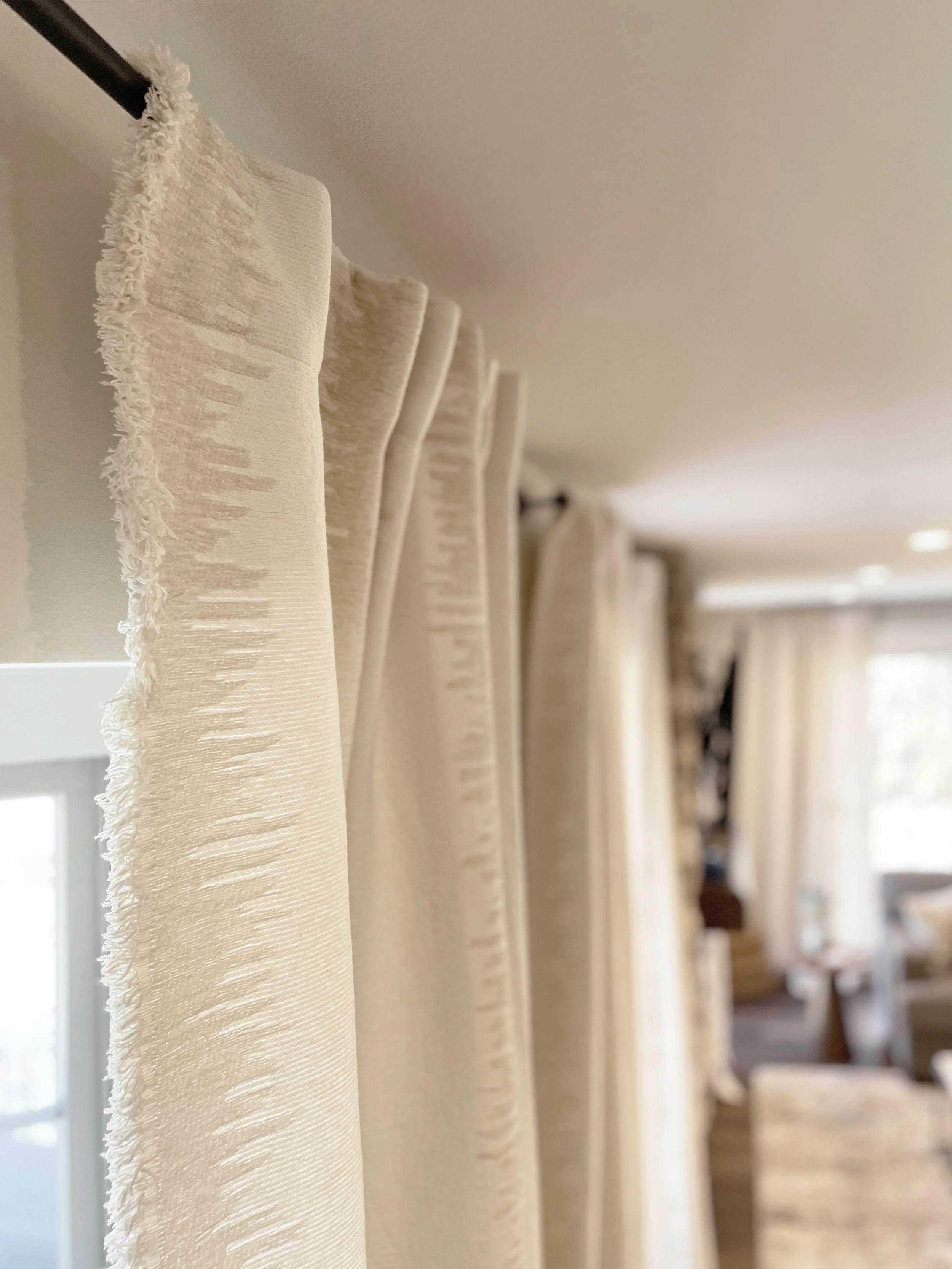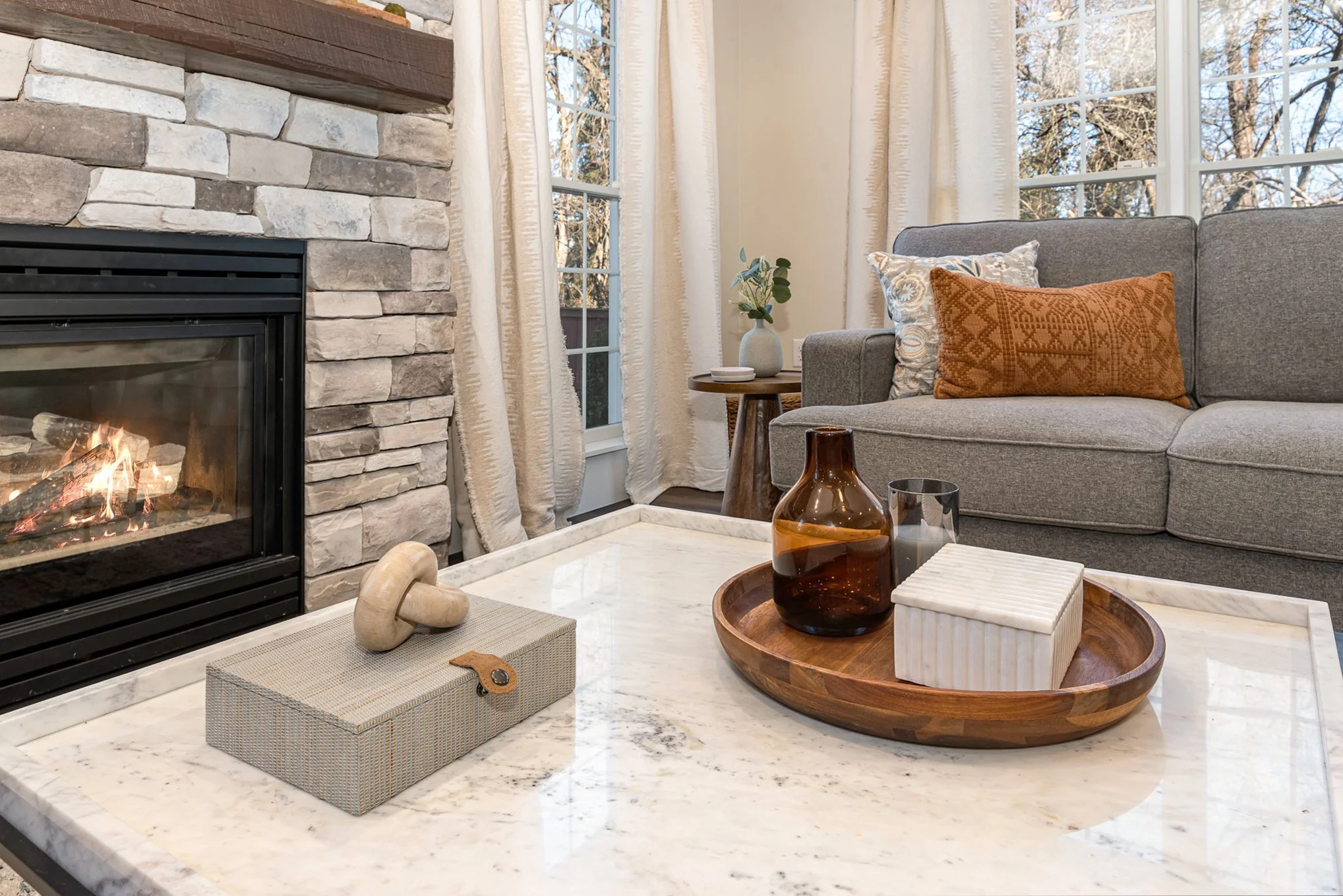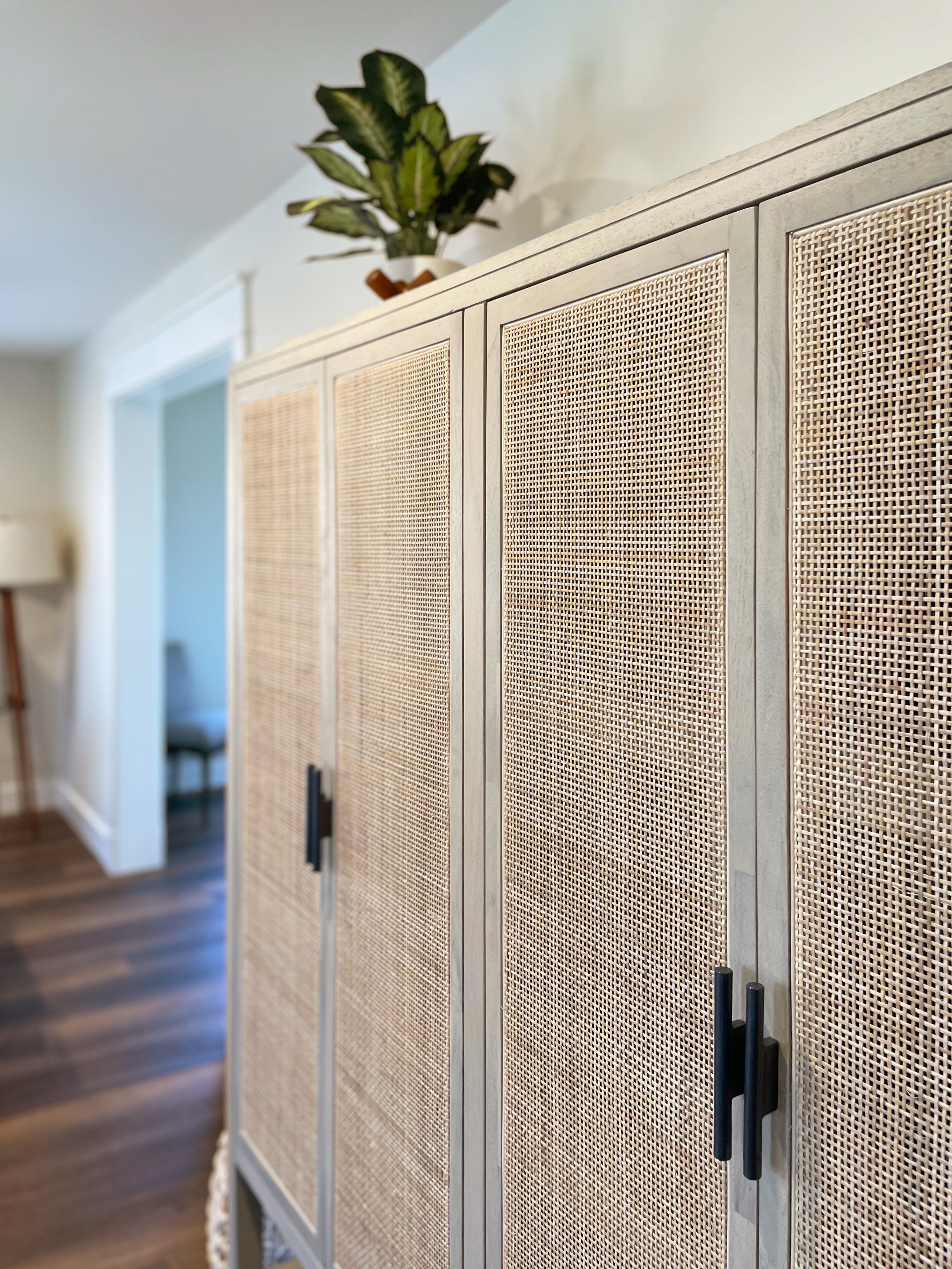 With the blend of warm woods, rich leather, bright natural neutrals, and a dash of cool grays and blues, this space really feels warm, cozy and inviting! A durable yet super soft rug, piles of plush pillows, and a woven throw blanket tossed over the armchair make this space super cozy, not to mention the collection of family photos, candles, and greenery that bring light and life into the space. We’ve designed a family room that truly feels like home!