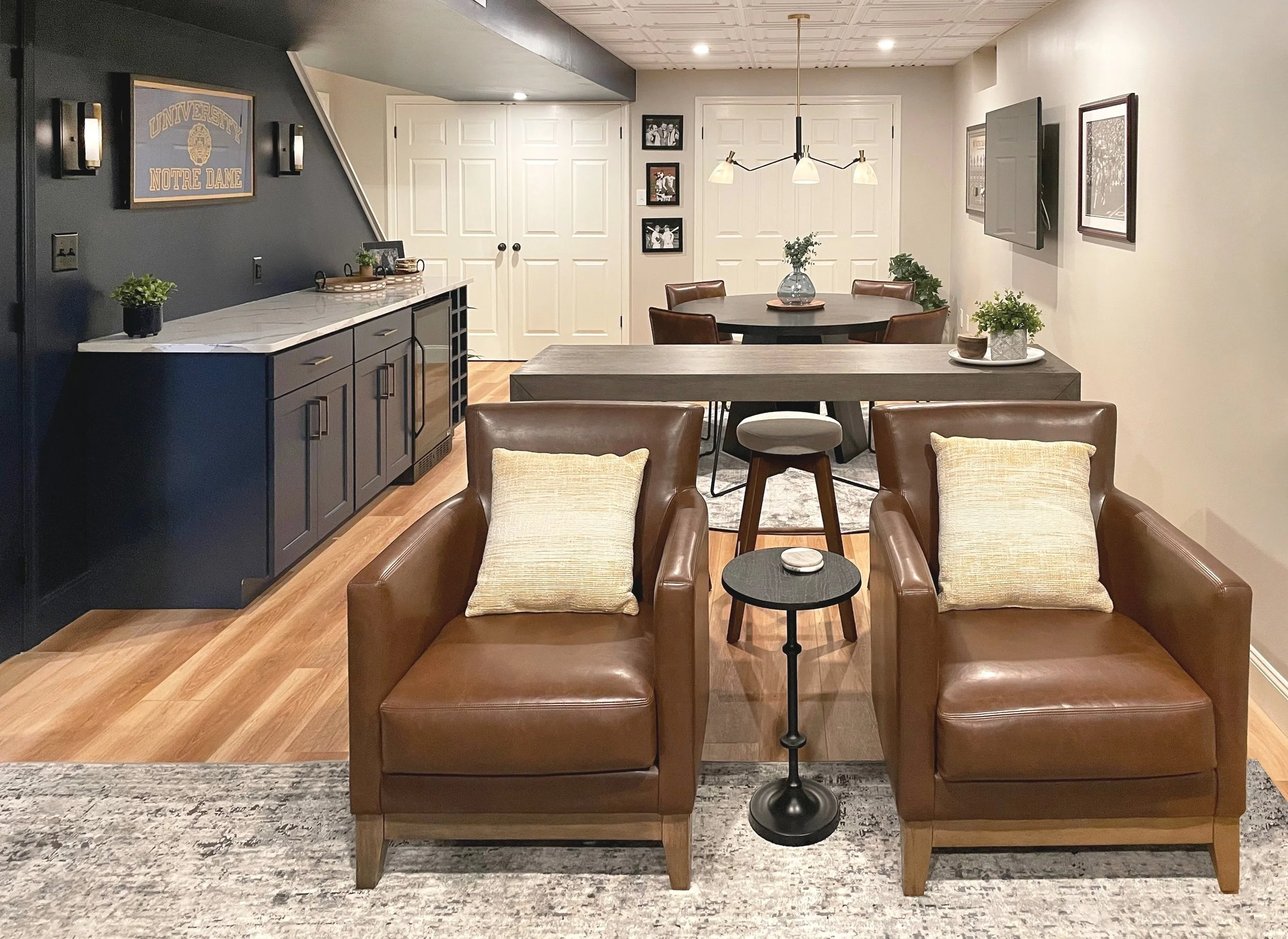 The previously underutilized basement space now serves as a multi-zone, multi-functional family room that even includes a separate home office space for those necessary work from home days. The client’s passion for sports is reflected in the collection of sports memorabilia framed on every wall, as well as the sophisticated interpretation of their favorite team’s colors found in the finishes and decor of the space. The deep navy beautifully contrasts with the warmth of the wood flooring and the rich textures of leather throughout, giving this space a strong yet cozy atmosphere. Whether they want to cheer on their favorite athletes, play a game of poker with friends, or have a family movie night, this basement haven is exactly the space this family asked for.